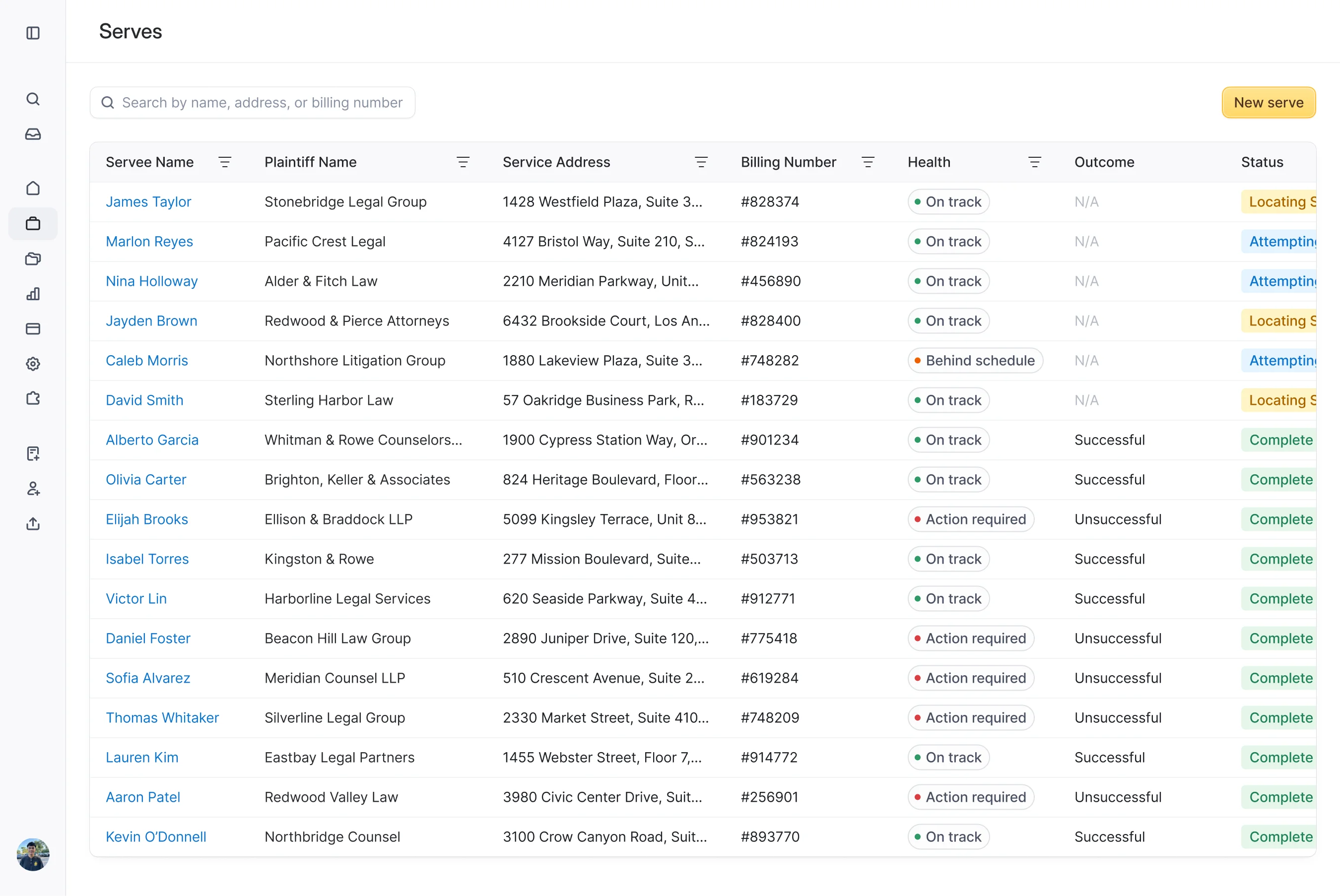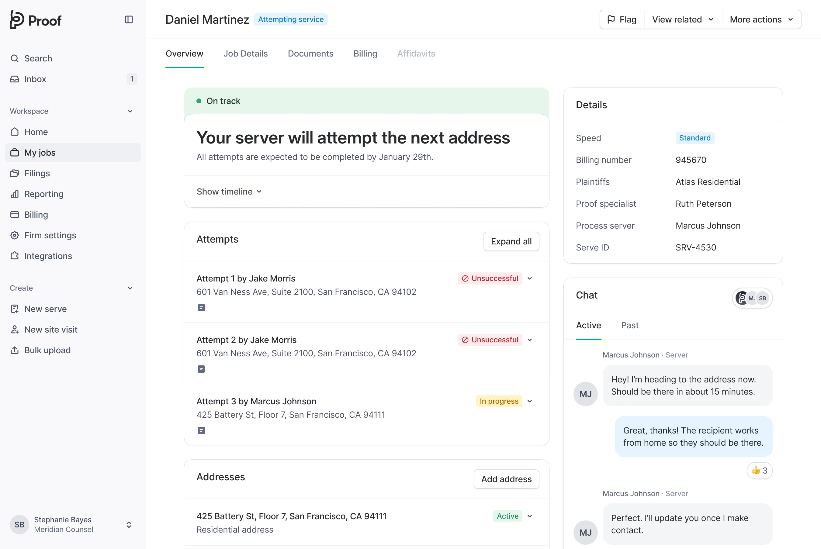Proof helps law firms manage service of process, where documents are delivered by real people and assignments change often. When work moved between servers, clients couldn't tell what had happened or what was current.